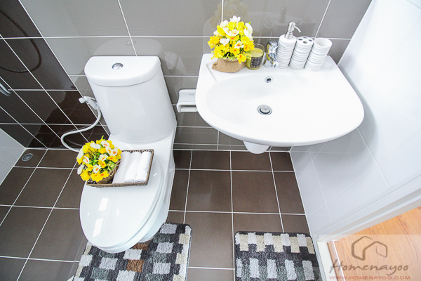 อ่างล้างหน้าของ Mogen พร้อมตู้เก็บของใต้อ่าง ติดกันวางโถสุขภัณฑ์ของ Nahm ผนังทำ Low wall ไว้วางอุปกรณ์ในห้องน้ำ