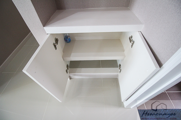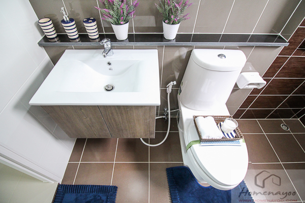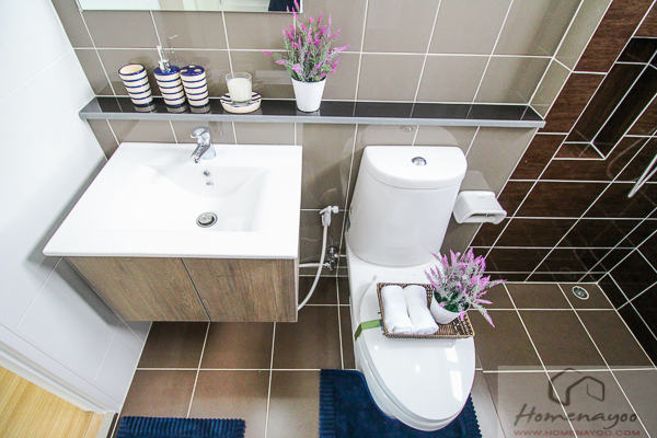 อ่างล้างหน้าได้ของ Mogen พร้อมตู้เก็บของใต้อ่างล้างหน้า ติดกันวางโถสุขภัณฑ์ของ Nahm ผนังทำเป็น Low Wall วางของได้