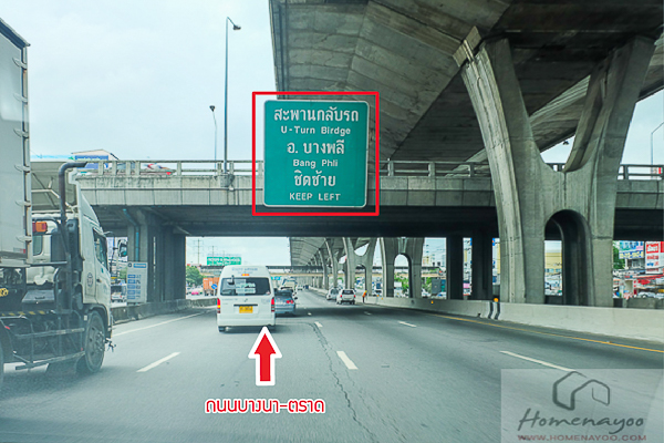 ให้ชิดเลนขวาไว้ครับจะเป็นช่องสำหรับกลับรถ ส่วนฝั่งซ้ายจะเป็นทางขึ้นทางด่วนบูรพาวิถี