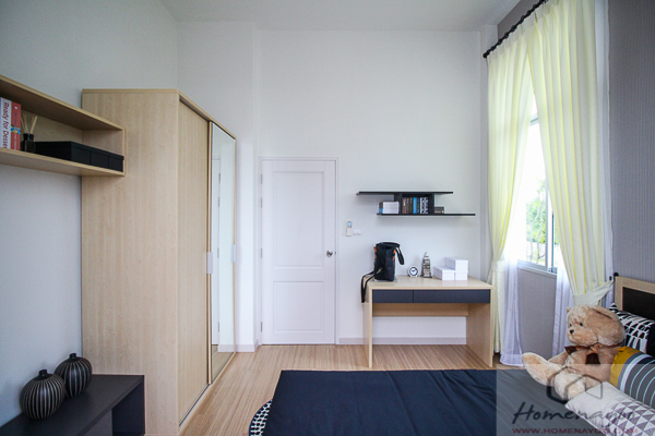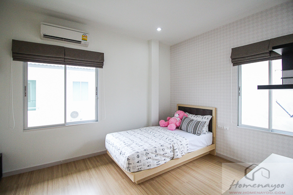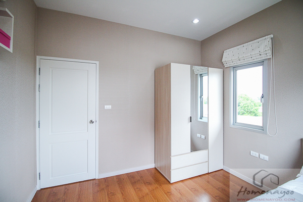 ภายใน Master Bedroom มีประตูระเบียงฝั่งหัวเตียงด้วยครับ ห้องนี้จะมีแอร์ติดให้ 1 ตัว