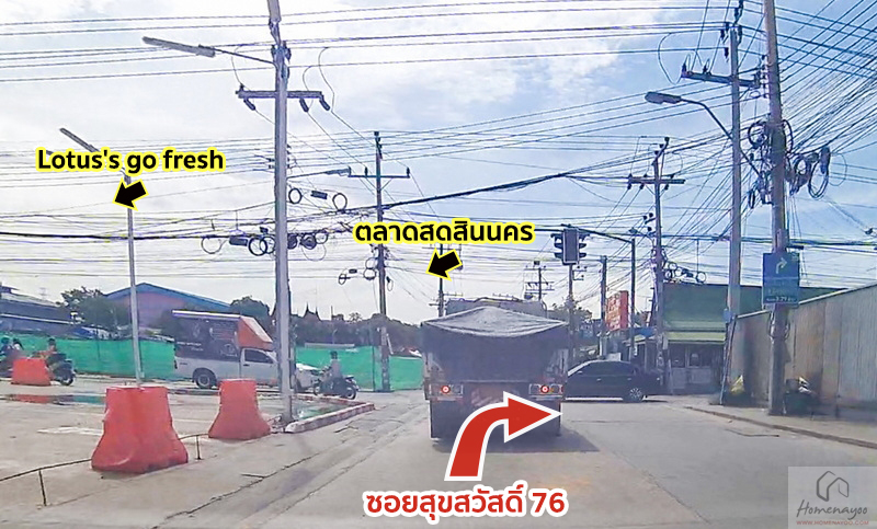 ตรงตามทางต่อไปเรื่อย ๆ จนถึงทางแยกบริเวณ Lotus’s go fresh และตลาดสดสินนคร ให้เลี้ยวขวาเพื่อเข้าสู่ซอยสุขสวัสดิ์ 76