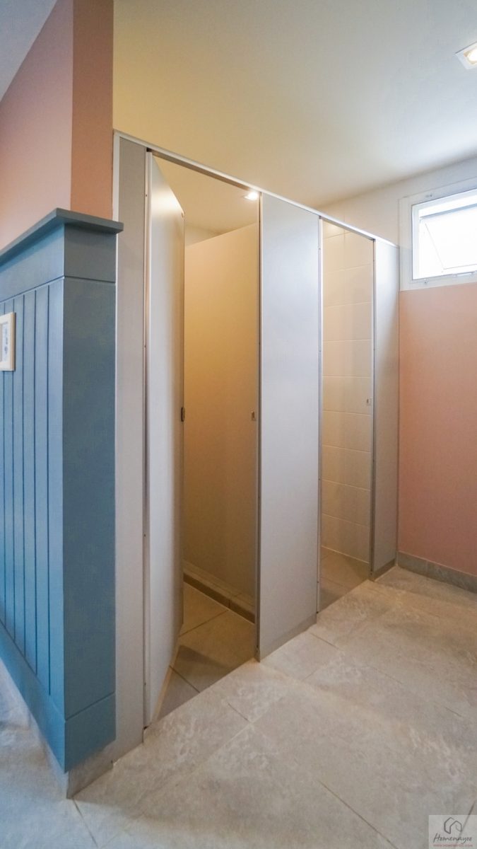 ถัดมาเป็นมุมอาบน้ำที่มีการลดระดับพื้นลงเล็กน้อย เพื่อป้องกันน้ำไหลออกไปยังส่วนอื่น ๆ ของห้อง มีช่องแสงเป็นหน้าต่างบานกระทุ้งกระจกฝ้าช่วยระบายอากาศและความชื้นได้ดี