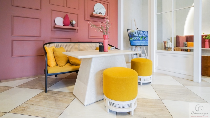 ฝั่งซ้ายของห้องมีการ Built-in เป็นชุดโซฟาแล้ววางเป็นโต๊ะไม้