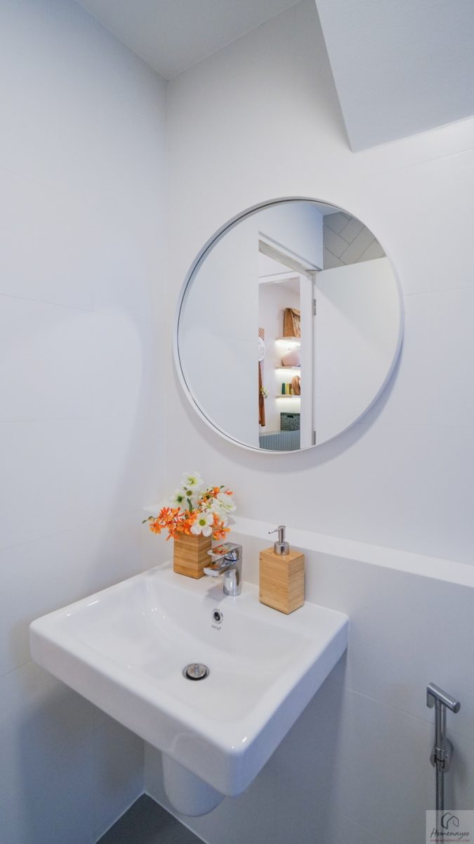 มุมอ่างล้างหน้าใช้อ่างทรงเหลี่ยมแบบแขวนผนังของ Cotto ก๊อกน้ำโครเมียมก้านโยกเปิด-ปิดใช้งานสะดวก ที่ผนังติดกระจกเงาบานใหญ่ทรงกลมมาให้ 1 บาน ด้านหลังก่อเป็น Low Wall ใช้วางของใช้ต่าง ๆ หรือของตกแต่งเล็กน่ารัก ๆ ได้