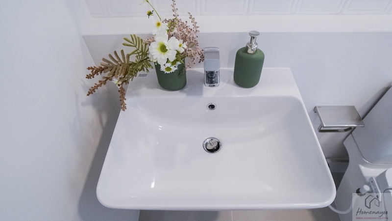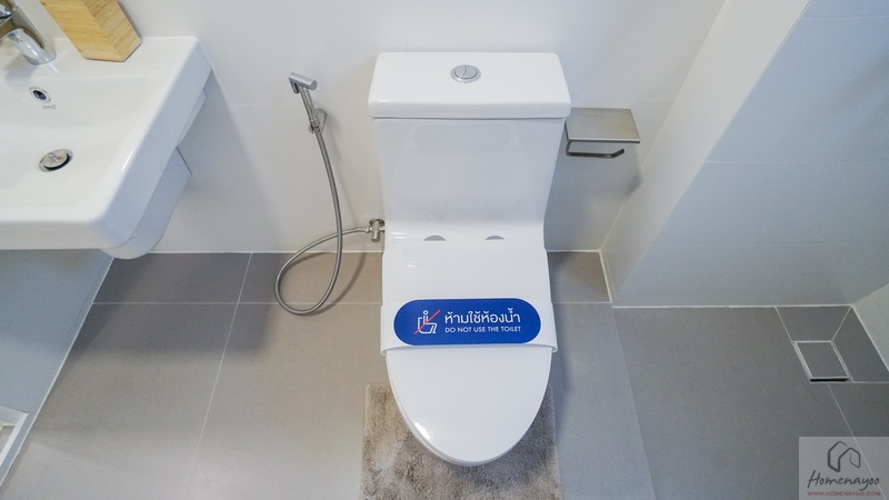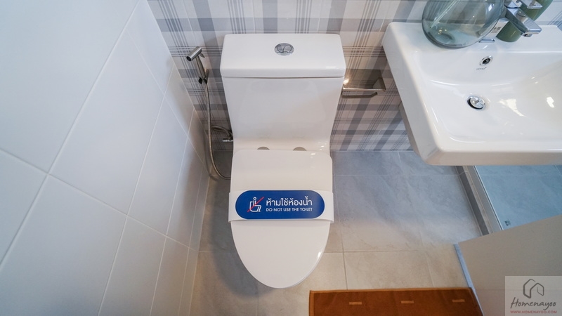 ติดกันเป็นโถสุขภัณฑ์ 2 Piece ระบบ Dual Flush ระยะการใช้งานกำลังดี พร้อมติดตั้งสายฉีดชำระและที่แขวนกระดาษทิชชูสแตนเลสมาให้ครบเซ็ต ด้านข้างใต้อ่างล้างหน้ามีพื้นที่เหลือให้วางตะกร้าผ้าหรือถังขยะใบเล็ก ๆ ได้อีก