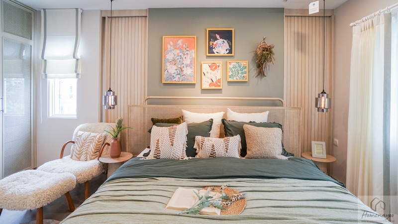 ฝั่งหัวเตียงวางโต๊ะหัวเตียงไว้ 2 ฝั่งให้ดูระยะการใช้งาน
