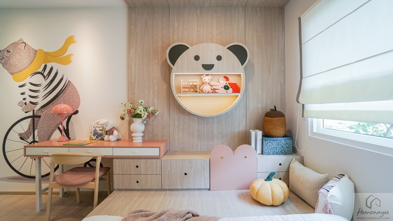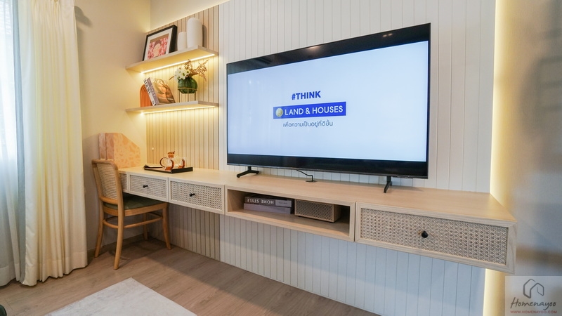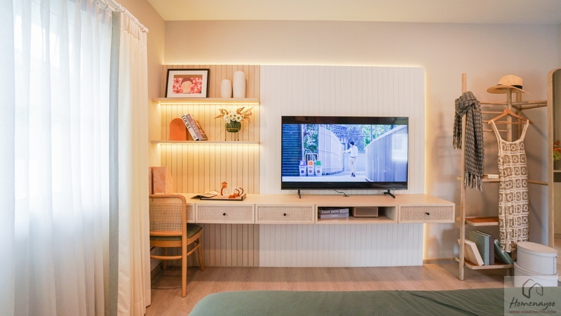 ส่วนฝั่งปลายเตียง Built-in เป็นชั้นวางทีวีพ่วงกับโต๊ะอ่านหนังสือไปในตัวให้ดูเป็นไอเดีย ติดกันตั้งเป็นชั้นวางของได้อีก