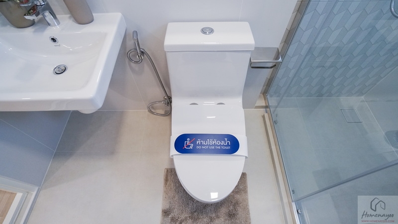 ภายในตกแต่งด้วยกระเบื้องโทนสีขาว-เทา สุขภัณฑ์มาตรฐานใช้เป็นของ Cotto หรือเทียบเท่า มีพื้นที่ใช้งานเยอะไม่อึดอัด มีการแยกส่วนแห้งส่วนเปียกชัดเจนด้วยการลดระดับพื้นลงเล็กน้อยบริเวณโซนอาบน้ำ