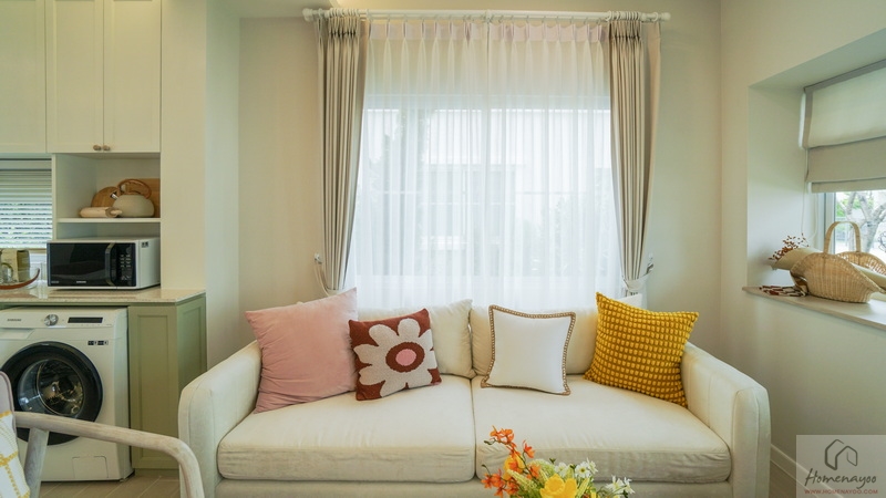 ข้างเตียงทางฝั่งซ้ายบ้านตัวอย่างจัดเป็นมุมพักผ่อน หรือจะเปลี่ยนเป็นมุมโต๊ะเครื่องแป้งหรือโต๊ะทำงานก็ได้ จุดนี้มีหน้าต่างเป็นช่องรับแสงธรรมชาติให้ 1 บาน