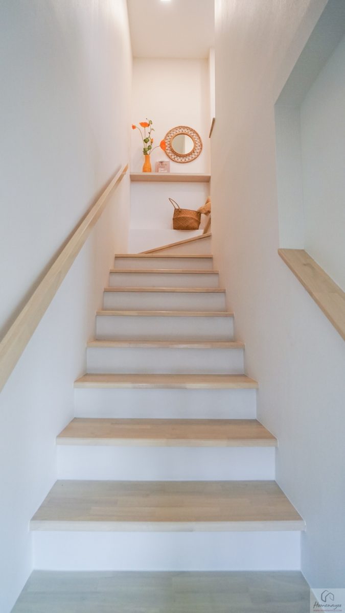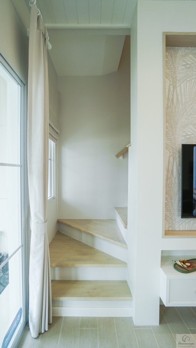 ขึ้นไปดูที่ชั้น 2 ของบ้านกันต่อเลย โดยโถงบันไดจะอยู่กลางบ้านติดกับห้องครัวและห้องน้ำชั้นล่างเลย บันไดบ้านมีราวจับแบบฝังผนังมือจับเป็นไม้ชนิดเดียวกับลูกนอน ทำให้เดินขึ้น-ลงได้อย่างปลอดภัย