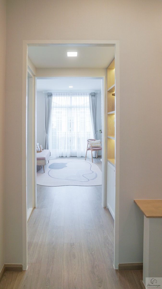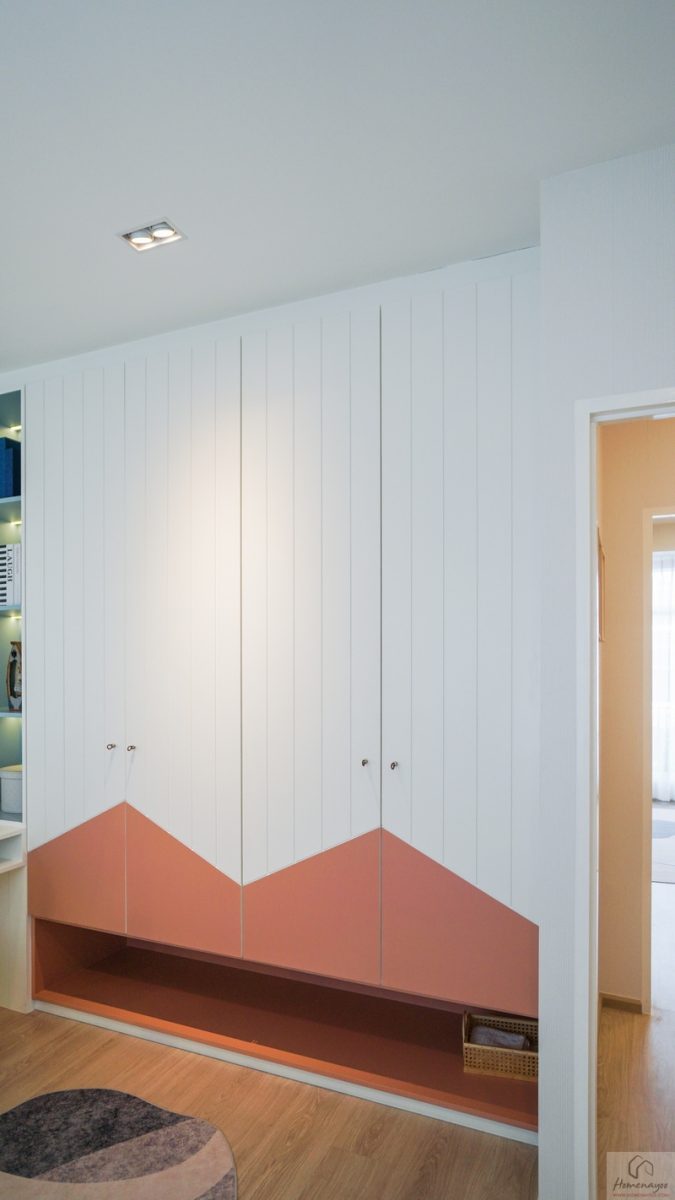 หรือจะทำเป็นโซน Walk-in Closet ก็ได้นะคะ บริเวณนี้มีการ Built-in เป็นตู้เสื้อผ้าบานเปิดขนาดใหญ่ทรงสูงจรดเพดานมาให้ดูเป็นไอเดีย