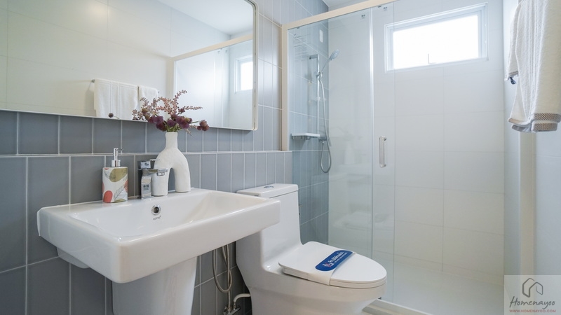 ภายในห้องน้ำมีการแยกโซนแห้ง-เปียกให้ด้วย Shower Box เช่นเดียวกัน ตกแต่งพื้นและผนังด้วยกระเบื้องห้องน้ำโทนสีขาว-เทา สลับกับกระเบื้องแบบมีลวดลาย มีช่องแสงเป็นหน้าต่างบานกระทุ้งกระจกฝ้าช่วยระบายอากาศและความชื้นได้ดี