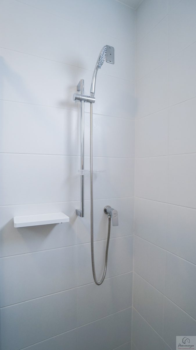 ใช้ฝักบัว Hand Shower ของ Cotto พร้อมราวปรับระดับติดที่วางสบู่มาให้คู่กับก๊อกน้ำโครเมียมก้านโยก ผนังมีพื้นที่ให้ติดตั้งเครื่องทำน้ำอุ่นหรือจะหาชั้นวางของมาติดเพิ่มเติมก็ได้