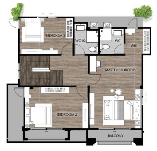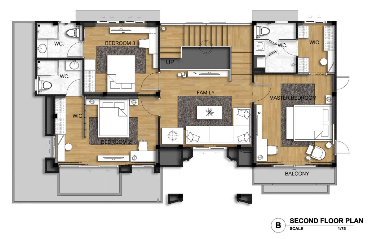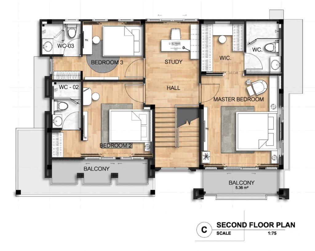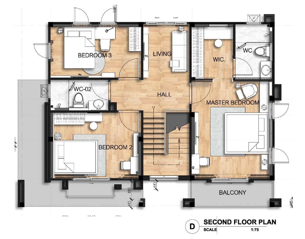 แปลนบ้านชั้น 2 จากโถงบันไดจะเชื่อมสู่ Living Area บนชั้น 2 เป็นโถงกลางที่เชื่อมต่อกับห้องนอน 3 ห้อง โดยมีห้องนอน 2 และห้องนอน 3 อยู่ฝั่งซ้ายแบ่งพื้นที่กันประมาณคนละครึ่ง มีห้องน้ำอยู่ตรงกลางให้ใช้ร่วมกัน ส่วน Master Bedroom จะอยู่ฝั่งขวา โดยใช้พื้นที่ตั้งแต่ฝั่งหน้าบ้านไปจนถึงฝั่งหลังบ้าน และมีห้องน้ำให้ในตัวค่ะ