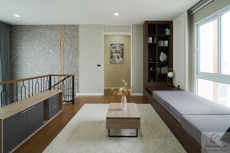 ส่วนพื้นที่ใต้บันไดนั้นเราทำ Built-in เป็นชั้นวางของโชว์หรือทำเป็นตู้เก็บของตามแบบบ้านตัวอย่างได้นะ
