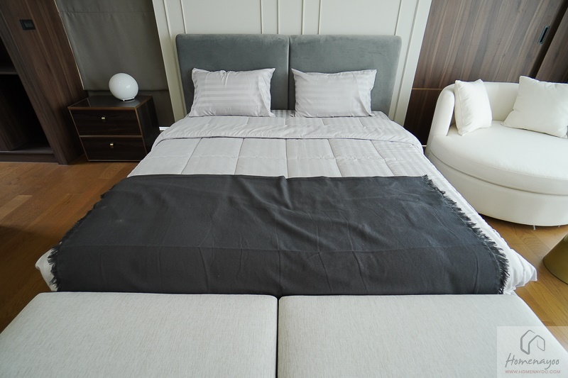 บ้านตัวอย่างวางเตียงขนาด 6 ฟุตมาให้ดูเป็นไอเดีย และวางม้านั่งปลายเตียงเพิ่มเข้าไป