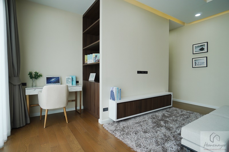 ซึ่งบริเวณฝั่งปลายเตียง บ้านตัวอย่างมีการแบ่งพื้นที่ก้อนนี้ออกไปเป็น Foyer ด้านหน้าห้อง ก็เลยมีพื้นที่ด้านข้างนี้เกิดขึ้นมาทำเป็นมุมสำหรับนั่งทำงานและชั้นเก็บหนังสือ ถือว่าเป็นไอเดียการใช้พื้นที่ที่ดีเลยค่ะ
