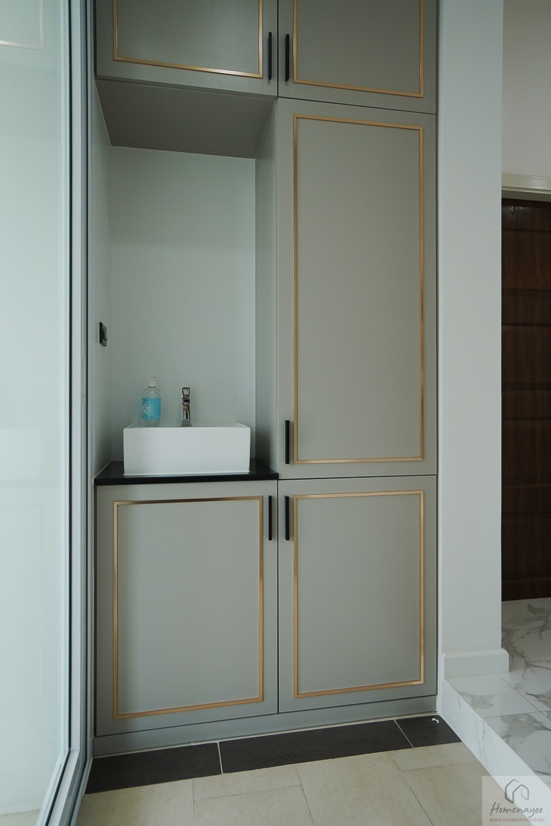 จากโรงจอดรถเข้ามาภายในบ้านก็จะเจอ Mudroom ก่อนค่ะ ขนาดพื้นที่ก็จะเล็กลงมาหน่อย ทำ Built-in ตู้เก็บรองเท้าและเคาน์เตอร์อ่างล้างมือได้ที่ฝั่งซ้าย