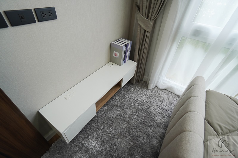 ฝั่งปลายเตียงยังวางชั้นเก็บของเพิ่มได้นะคะ ถ้าใครที่ชอบดูทีวีในห้องนอนด้วยก็มีงานระบบไฟเดินเอาไว้ให้เรียบร้อยแล้ว