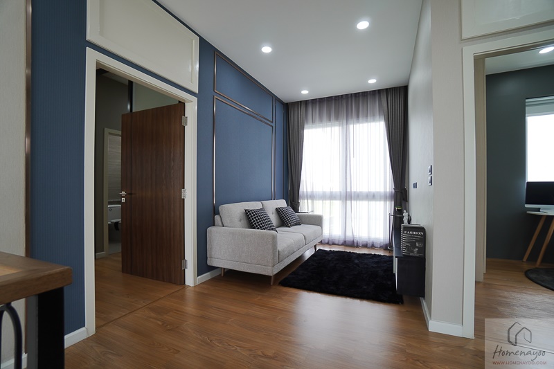พื้นที่ภายในห้องถือว่ามีขนาดใหญ่พอสมควรนะคะ จะวางโซฟาขนาด 3-4 ที่นั่งหรือโซฟา L Shape ได้เลย โต๊ะกลางที่วางได้ก็เป็นไซซ์ใหญ่