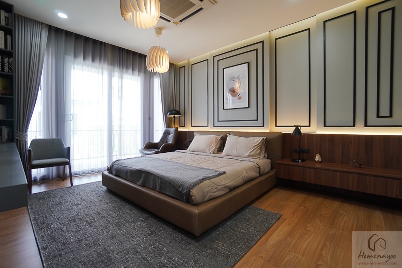 สำหรับห้อง Master Bedroom จะอยู่อีกฝั่งค่ะ บ้านตัวอย่างออกแบบกั้นส่วนพื้นที่ด้านหน้าห้องให้เป็น Foyer เพื่อความเป็นส่วนตัว เวลามองเข้าไปด้านในห้องตรง ๆ ก็จะมองไม่เห็นพื้นที่ด้านในห้องจริง ๆ