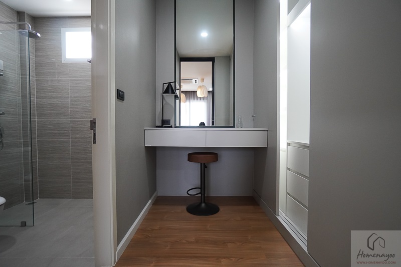 นอกจากนี้บ้านตัวอย่างยังกั้นส่วนพื้นที่บริเวณด้านหน้าห้องน้ำทำเป็น Walk-in Closet และโต๊ะเครื่องแป้งให้ดูเป็นไอเดียค่ะ