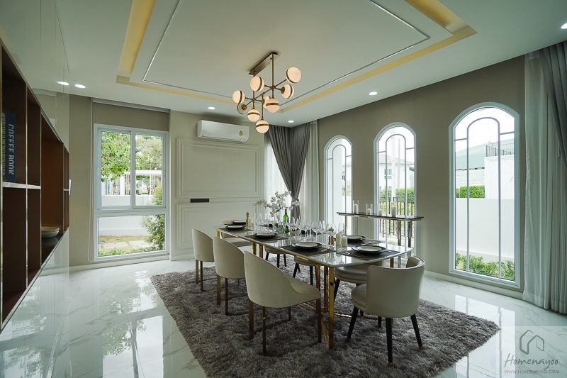 บ้านตัวอย่างจัดชุดโต๊ะรับประทานอาหารขนาด 6 ที่นั่ง พร้อม Pantry และตู้เย็นมาให้ดูเป็นไอเดีย พื้นที่บ้านก็ยังเหลือแบบสบาย ๆ น่าจะสามารถจัดมุมนั่งทำงานหรือมุมนั่งเล่นเพิ่มเข้าไปได้อีกนะ