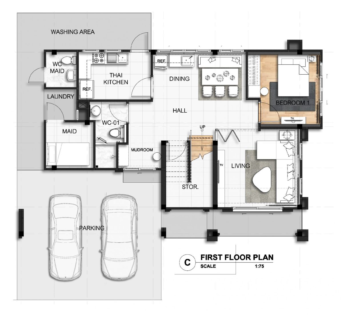แปลนบ้านชั้น 1 เริ่มจากบริเวณโรงจอดรถจะสามารถจอดรถได้ 2 คันในร่ม มีทางเข้าบ้านรองใกล้ส่วน Service ของบ้าน เป็น Mudroom, Dining Room, ห้องน้ำแขก และห้องครัว เชื่อมต่อกับพื้นที่ลานซักล้างหลังบ้าน ส่วนทางเข้าบ้านหลักจะอยู่ฝั่งหน้าบ้านตรงเฉลียงทางเข้า เข้าไปจะเป็น Living Room เชื่อมต่อกับ Dining Room, ห้องนอนชั้นล่าง และโถงบันไดขึ้นสู่ชั้น 2
