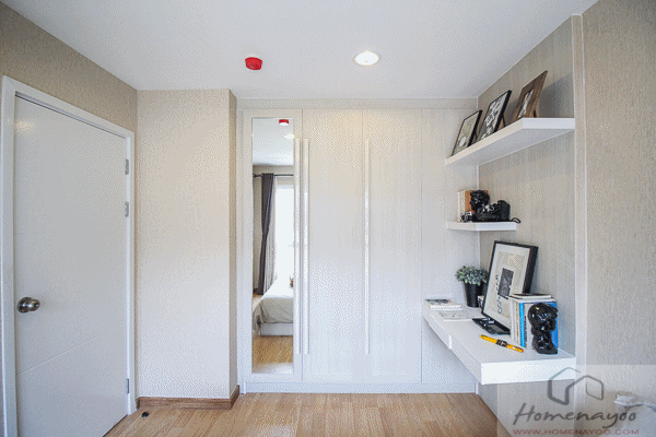 ฝั่งด้านใน Built-in ตู้เสื้อผ้ามาให้ ขวามือเป็นชั้นวางของและโต๊ะทำงาน