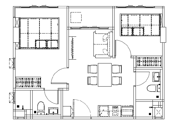 แต่โซน Pantry จะถูกย้ายมาอยู่ฝั่งติดผนังประตูทางเข้าแทน โดยมีโต๊ะทานข้าวขนาดใหญ่กั้น ประตูห้อง Master Bed จะอยู่ข้างโซฟา