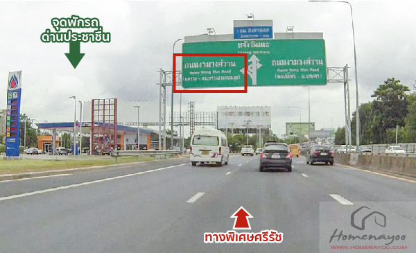 เมื่อลงมาแล้วก็จะเจอป้ายบอกทางแยก ให้ออก ถ.งามวงศ์วาน (แคราย) ด้านซ้ายมือ