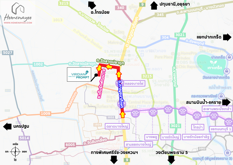 CentralPlaza WestGate ถ.กาญจนาภิเษก ⇒ รถไฟฟ้าสายสีม่วง สถานีตลาดบางใหญ่ ⇒ สถานีคลองบางไผ่ ⇒ ถ.วัดลาดปลาดุก ⇒ ซ.เต็มรักพัฒนา 9 ⇒ ถึงโครงการ Viridian Prompt ซ.เต็มรักพัฒนา 9 (วัดลาดปลาดุก)