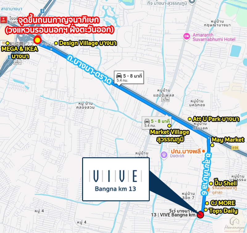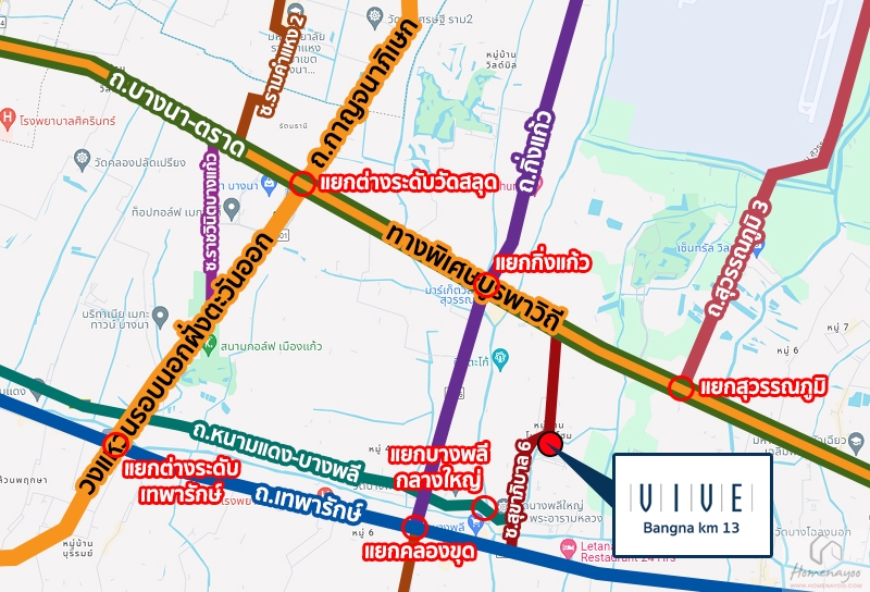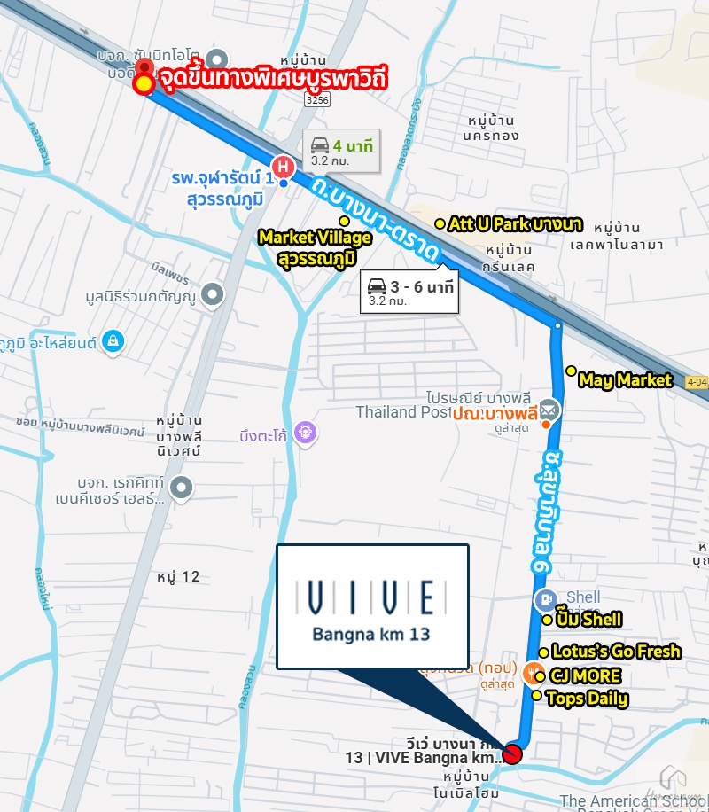 ถึงทางเข้าสู่โครงการให้เลี้ยวซ้าย โดยจะมีถนนภาระจำยอมเชื่อมเข้าสู่ตัวโครงการอีกที ด้านในเป็นพื้นที่ขนาดใหญ่ปัจจุบันมี 3 โครงการ คือ VIVE Bangna km 13, CHAIYAPRUEK บางนา กม.13 และ siwalee บางนา กม.13