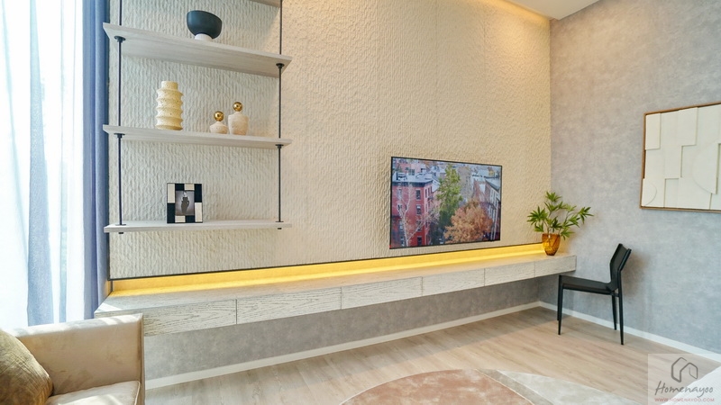 ขณะที่ฝั่งปลายเตียงสามารถ Built-in เป็นชั้นวางทีวีได้แบบเต็มพื้นที่ จะแบ่งฟังก์ชันจัดเป็นมุมโต๊ะทำงานหรือโต๊ะเครื่องแป้งเพิ่มเติมก็ได้