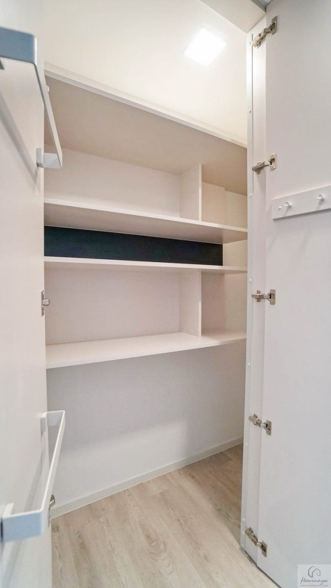 ระหว่างทางเดินฝั่งซ้ายจะมีห้องเก็บของมาให้ ทางโครงการ Built-in ชั้นวางของและบานประตูมาให้เรียบร้อย