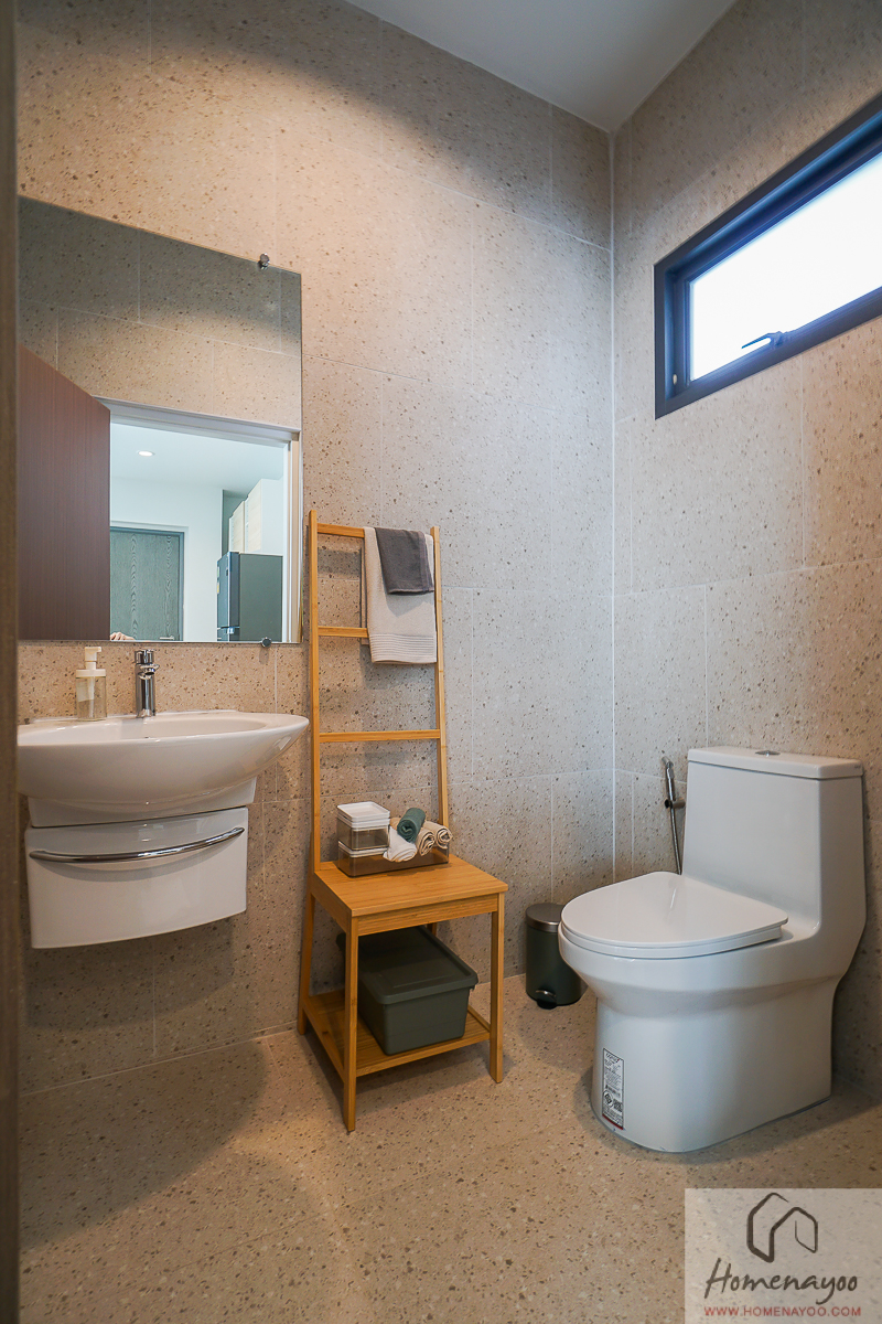 ห้องนอนรองทั้ง 2 ห้อง จะใช้ห้องน้ำแชร์กันค่ะ สามารถเข้าใช้งานได้จากโถงห้องนั่งเล่น โดยห้องน้ำมีขนาดที่ค่อนข้างกว้างเลย ภายในตกแต่งออกมาน่าใช้งาน ใช้กระเบื้องโทนสีอ่อนลายหิน แยกโซนแห้ง-โซนเปียกมาให้เรียบร้อย โดยในโซนอาบน้ำนี่เราก็สามารถกั้น Shower Box เพิ่มได้นะคะ