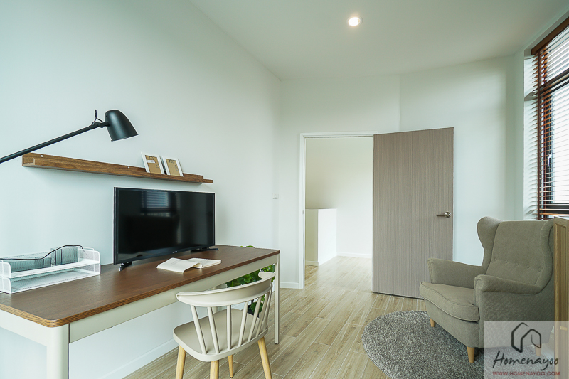 ห้องอเนกประสงค์นี้เราจะจัดให้เป็นห้องนอนเล็กอีกห้องนึงก็ได้ค่ะ วางเตียงเดี่ยวไว้รับรองแขกก็กำลังดีเลย โดยจุดเด่นของห้องนี้คือช่องแสงขนาดใหญ่ และเป็นห้องที่มองออกไปเห็นส่วนระเบียงได้ด้วย จึงเหมาะที่จะทำเป็นห้องทำงานด้วยเหมือนกันนะ เวลาทำงานเหนื่อย ๆ ก็ออกไปยืดเส้นยืดสายตรงระเบียงได้ค่ะ