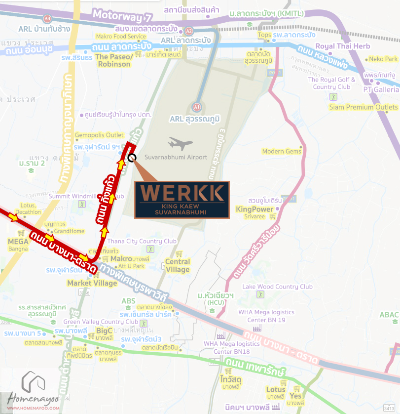 การเดินทาง ถ.บางนา-ตราด ⇒ ถ.กิ่งแก้ว ⇒ กลับรถ (ใกล้กับ รพ.จุฬารัตน์ 9) ถึงโครงการ WERKK กิ่งแก้ว-สุวรรณภูมิ *ตรงข้าม รพ.จุฬารัตน์ 9